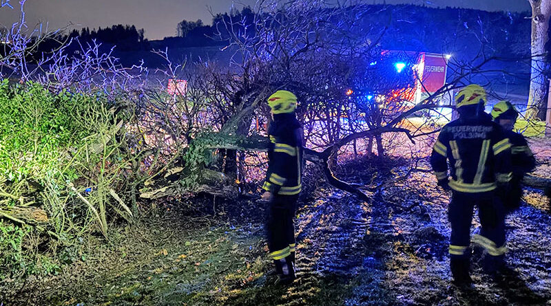 24.02.2026: Autobergung nach Pkw-Sturz in Bach mit Personenrettung auf B 134 in Fraham
