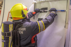 Anschließend wurde der Bereich des in Brand geratenen Hoiztrames abgedeckt und kleinere Brandnester abgelöscht. Weitere Abräumungsarbeiten wurden über den Korb der Teleskopmastbühne getätigt, um sicher zu gehen, keine versteckten Glutnester zurückzulassen und eine Neuentfachung des Brandes zu ermöglichen.