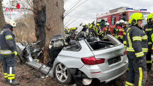 Aus 17 m Entfernung wurde das Löschfahrzeug schließlich mit dem Kran gesichert, die Hubkraft reichte jedoch aufgrund der großen Distanz für ein Anheben nicht mehr aus. So wurden Hebekissen zum Einsatzgebracht. Eines der Wilheringer Kameraden und ein knapp 60 Tonnen Hebekissen von der FF Alkoven. Nichts desto trotz war es unumgänglich, das Kranfahrzeug näher am Löschfahrzeug zu positionieren. Aus der anderen Richtung war dies nicht möglich, so dass die Entscheidung gefällt wurde, weiter straßenmittig nochmals einen Anlauf zu nehmen und die ausgefahren Stützen als Sicherung zu verwenden, sollte der unterspülte Boden weiter nachgeben. Diese anvisierte Methode führte schließlich zum Erfolg und im Zusammenspiel mit Kran und der beiden Hebekissen konnte das LF-A der FF Edramsberg angehoben werden. Soweit, dass es möglich wurde, eine Rampe zu bauen, über die man dann aus dem Krater fahren konnte. Gegen 01.30 Uhr wurden die Bemühungen der Feuerwehren Edramsberg, Wilhering und Alkoven schließlich belohnt und das Einsatzfahrzeug konnte geborgen werden. Und: Einzig offensichtlicher Schaden ist eine leicht angeknackste Plastikzierkappe am Vorderrad. Eine alles andere als alltägliche Hilfeleistung ging somit um 02.54 Uhr zu Ende.
