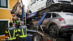 Schließlich wurde dann gegen 10.45 Uhr die Feuerwehr Alkoven zur Bergung des Autos alarmiert bzw. über das Diensthandy verständigt. Mit den entsprechenden Gummipaketen gesichert wurde das im Frontbereich beschädigte Unfallfahrzeug samt Unterstützung des Distanzbalkens mit einer anfänglichen Ausladung an der Leistungsgrenze (Distanz Bach zu Drehkranz) an- und dann auf die Straße bzw. direkt auf die Abschleppachse zurückgehoben. Im Anschluss daran erfolgte die Verbringung des Pkw von der Unfallstelle.