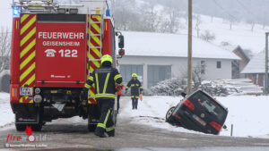 Über Gruppenalarm (Gruppe Kran und weitere Einsatzgruppe) am Personenrufempfänger wurden um 10.45 Uhr des 6. Jänner 2014 Mitglieder der Freiw. Feuerwehr Alkoven zu einem Bergungseinsatz alarmiert. In Höhe des Hundeabrichteplatzes an der B 129 sollte mit Kranbedarf ein Auto geborgen werden. Vor Ort zeigte sich den Helfern folgendes Bild bzw. folgende Darstellung: Bereits in der Nacht war der Lenker eines Pkw in Fahrtrichtung Eferding nach rechts von der B 129 abgekommen, über die Wiese einer Böschung weitergefahren und schlussendlich im Weidinger Bach gelandet, der derzeit kaum Wasser führt. Verletzt wurde bei dem Zwischenfall niemand, die Beteiligten machten sich so auf den Weg nach Hause. Mehrmals dürften jedoch Autolenker, die das Fahrzeug entdeckten, angehalten und Nachschau gehalten haben, ob Hilfe benötigt werden würde …