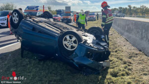 Im Gebäude selbst entdeckte der junge Atemschutztrupp schließlich den eingeklemmten Arbeiter. „Wir legten ihm gleich eine Fluchtmaske an“, so einer der Feuerwehrleute. „Damit haben wir zumindest etwas an Zeit gewonnen und ihm Schutz geboten.“ So komplex sich die Situation anfangs gestellt hat, so einfach war zumindest die folgende Menschenrettung. Durch Ansetzen des hydraulischen Spreizers konnte der Pkw soweit vom eingeklemmten Mann weggedrückt werden, dass dieser per Crash-Rettung befreit und ins Freie gebracht werden konnte. Der Brand selbst war kurz darauf gelöscht und der brandtechnische Part soweit abgeschlossen.