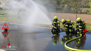Als Ausgangslage wurde der Anprall eines Lastwagens an eine Hausmauer beim Heizwerk in Hartheim herangezogen. Wesentlich waren hier einleitend die erforderlichen Sicherungsmaßnahmen zu setzen bzw. das Szenario einmal optimal und mit Verwendung der neuen Gerätschaften abzuarbeiten.