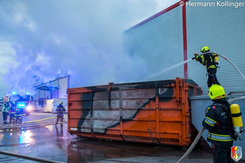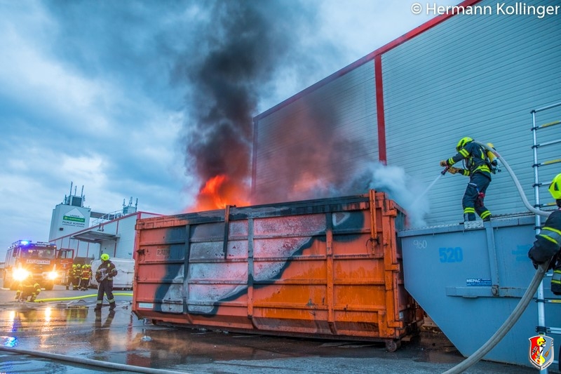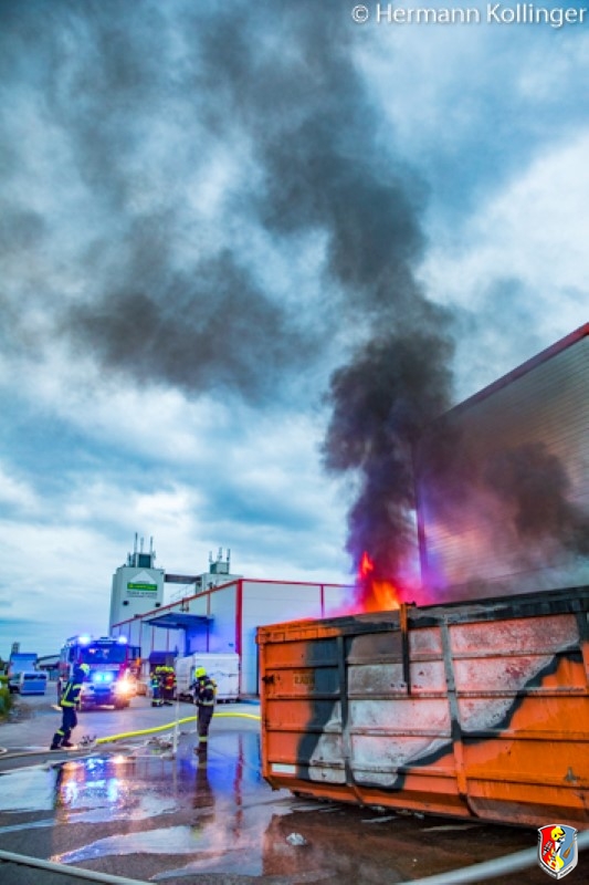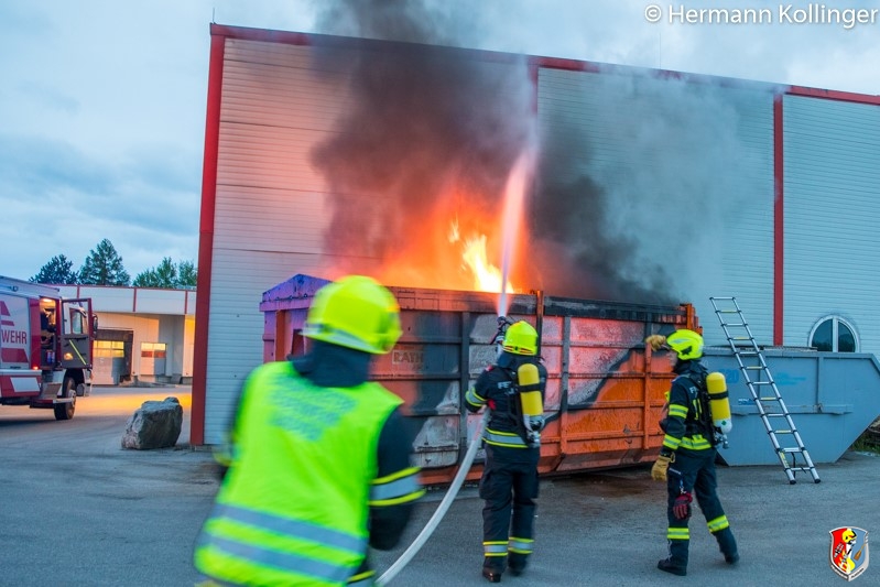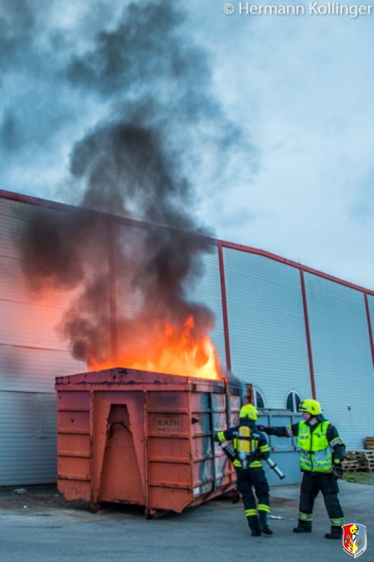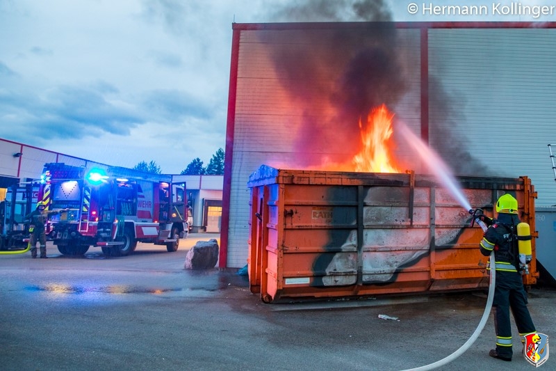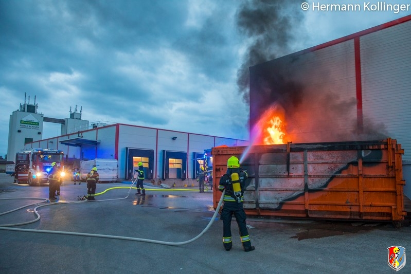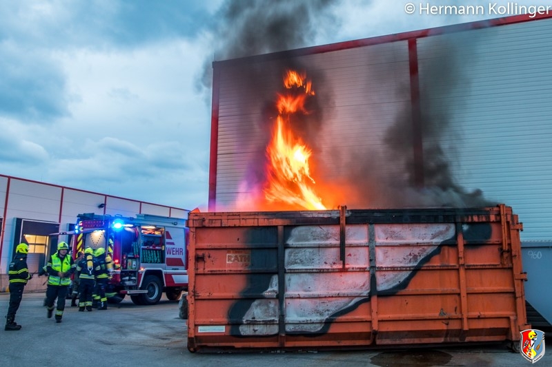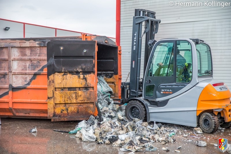 Vor Ort stand ein Großcontainer mit gepressten Plastikteilen in Flammen. Dieser war nach oben hin zur Hälfe offen und zur anderen Hälfte geschlossen. Ein Mann reagierte geistesgegenwärtig und versuchte, den Container mit einem Stapler von der direkt angrenzenden Gebäudewand zu schieben. Dies gelang auch zum Teil.