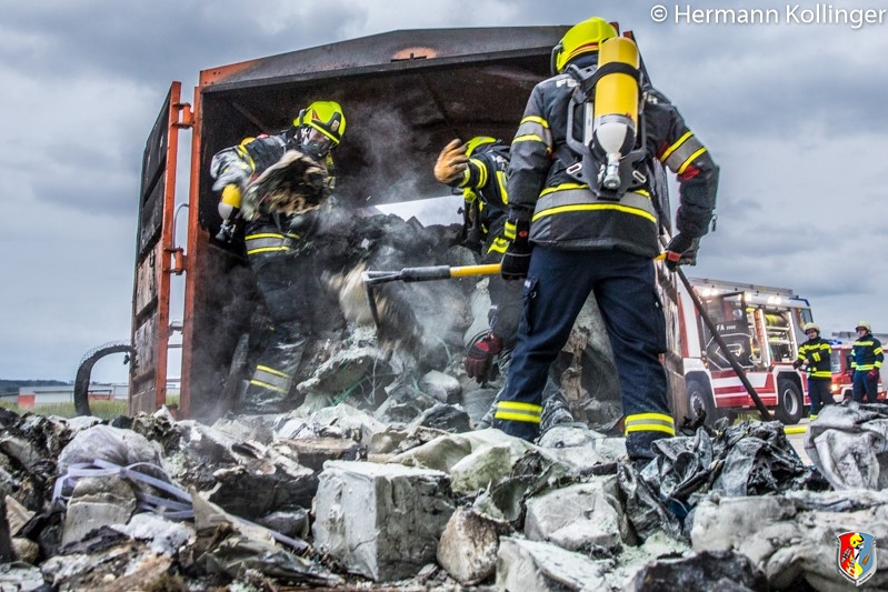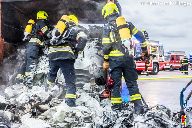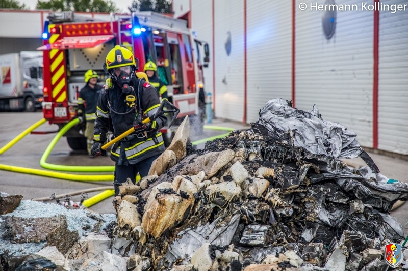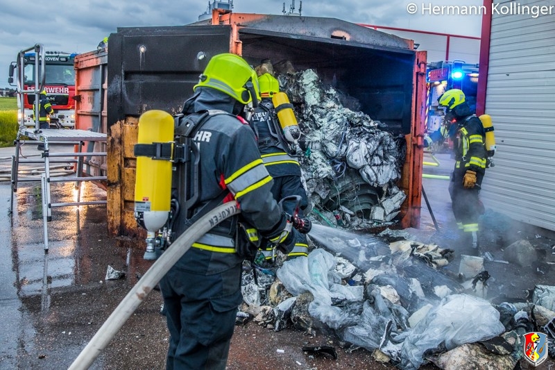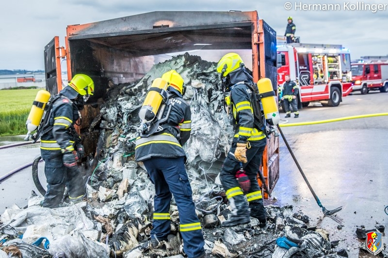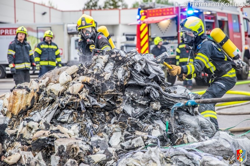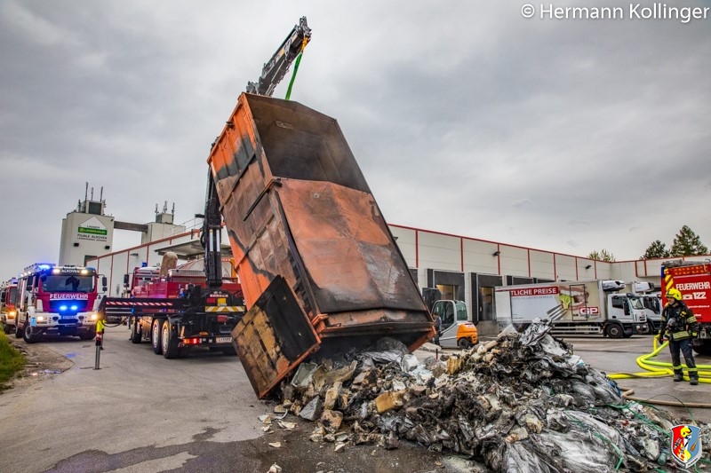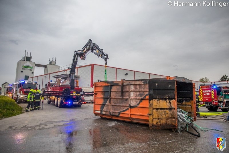 Da kein entsprechendes Hakenliftgerät zur Verfügung stand, wurde das Kranfahrzeug der Feuerwehr Alkoven beigezogen, um den Container anzuheben und das darin enthaltene Plastik zu entleeren. Es wurde zerteilt und dann unter Zusatz von Schaum als Netzmittel abgelöscht.