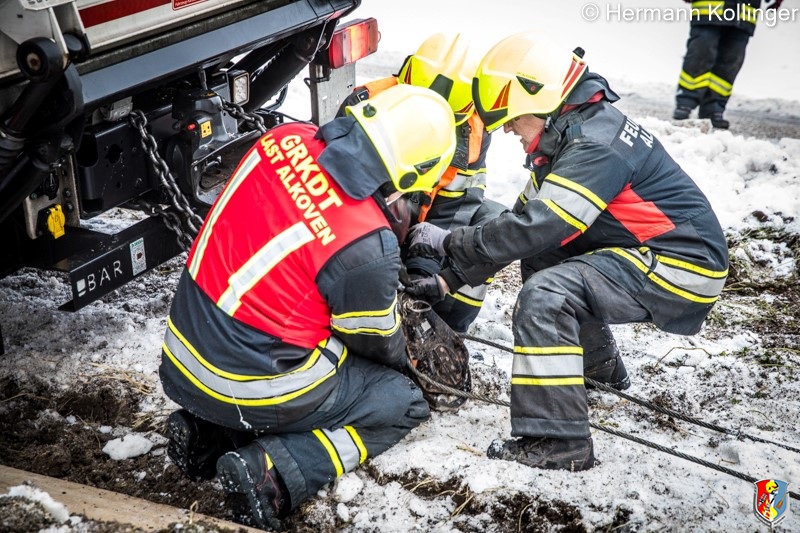 Da sich dieser nach dem ersten Zug gleich in die korrekte Richtung mitbewegte, ohne dabei abzurutschen oder noch weiter in Schräglage zu geraten, konnte die Bergung auf diese Weise fortgesetzt werden bis das gesamte Fahrzeug wieder auf festem Untergrund stand.