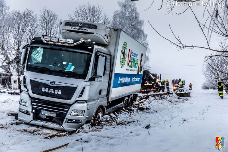 Dort war zuvor ein Dreiachs-Lkw in einer Rechtskurve nach einem abschüssigen Straßenstück aufgrund von Straßenglätte nach links von der Fahrbahn abgekommen. Das Fahrzeug kam schließlich erst nach einer längeren Morastfahrt in Schräglage zum Stillstand.