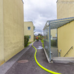 Vom Brand betroffen war eine Wohnung im mittleren Bau einer dreireihigen Wohnanlage mit jeweils zwei Geschoßen, die jedoch mit Fahrzeugen nicht zugänglich ist. So nahm die Besatzung des ersteintreffenden Tanklöschfahrzeuges der Feuerwehr Alkoven einen Verteilerangriff mit mehreren B-Längen bzw. in weiterer Folge über Schlauchtragekorb vor.