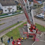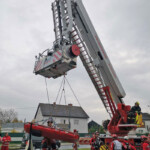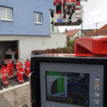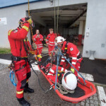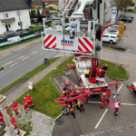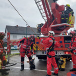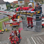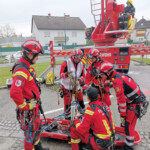 Ein wesentlicher Bestandteil war dann die Einbindung der Höhenretter, wenn die Lage einmal kniffliger wird. Baustellenunfälle, Schächte oder komplexe Dachflächen benötigen oft eine Rettung mit etwas mehr Aufwand. Da können die Höhenretter mit ihren Seiltechniken ebenso ausgezeichnete Unterstützung für eine schonende Patientenrettung oder nur dessen Transport sicherstellen. Hier kam die Teleskopmastbühne der Feuerwehr Alkoven zum Einsatz.