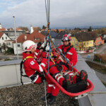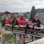 Aus der Theorie folgte am 5. November 2022 bei der Bezirksrotkreuzstelle die praktische Umsetzung. Zu dieser wurde ebenso die Freiw. Feuerwehr Eferding beigezogen, die das zweite im Bezirk Eferding verfügbare Hubrettungsgerät besitzt. Auf diese Weise waren somit eine Drehleiter sowie eine Teleskopmastbühne für die Schulung einsetzbar.