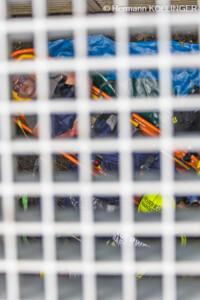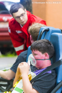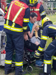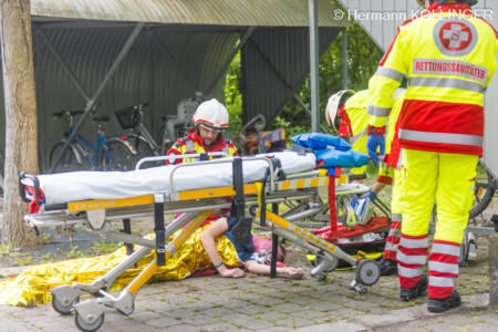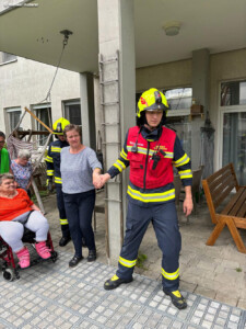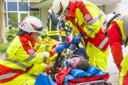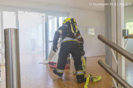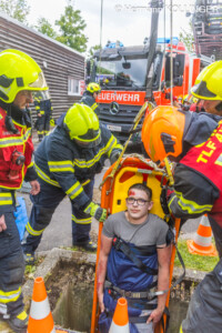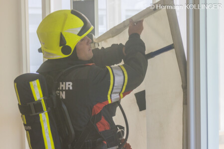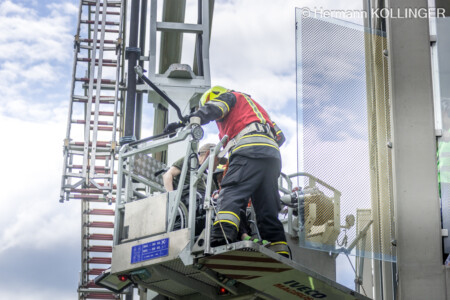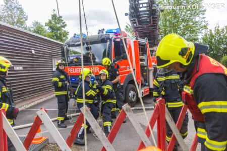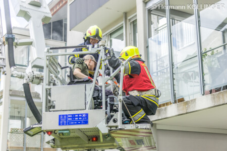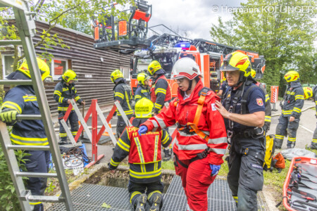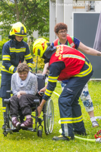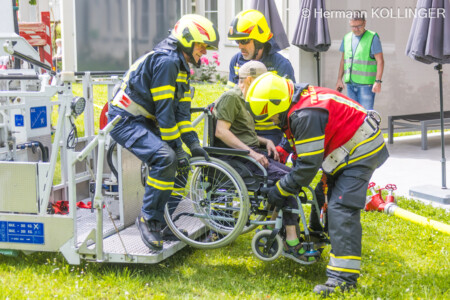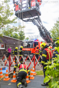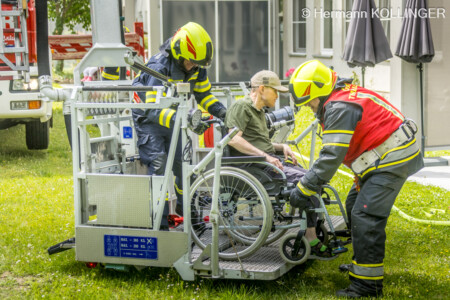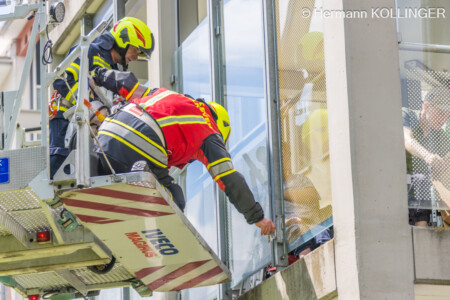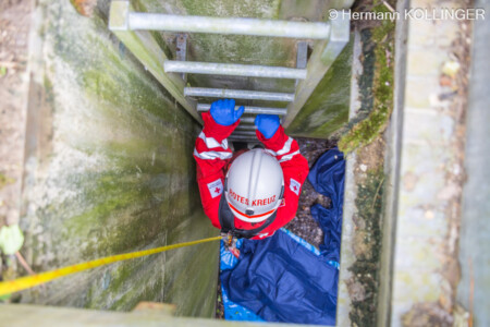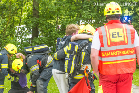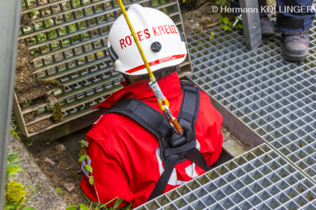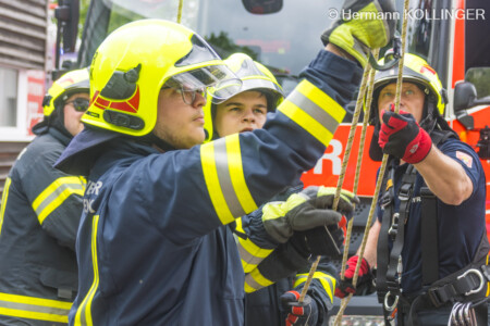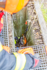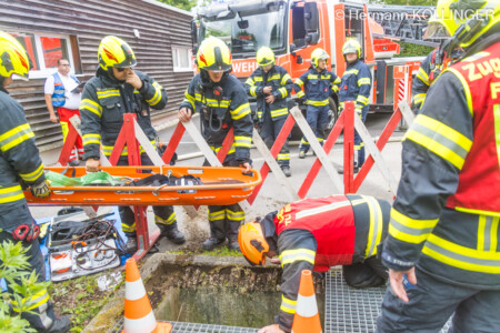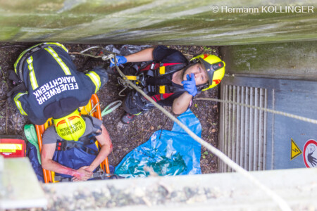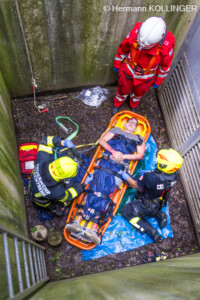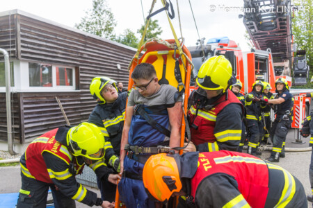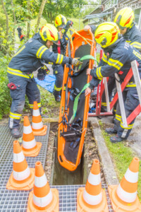 - Eine Person stolpert bei der Flucht vor dem Brand im Freien und stürzt in einen 5 m tiefen Schacht. Dieser war aufgrund von Arbeiten gerade offen. Der Patient spürte (als Annahme) seine Beine nicht mehr. Dieses Szenario wurde im Laufe der Übung eingespielt, um entsprechende Flexibilität und Zusammenarbeiten auch zwischen „fremden“ Feuerwehreinheiten zu fördern (die Höhenrettergruppen Alkoven und Axberg waren ausrüstungstechnisch gesehen aufgrund des vorliegenden Brandszenarios nicht präsent – daher musste improvisiert und vorhandes Material gesammelt und eingesetzt werden bzw. Einheitsverbände wurden dazu auch voneinander situationsbezogen getrennt).