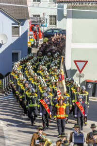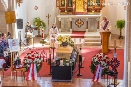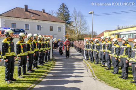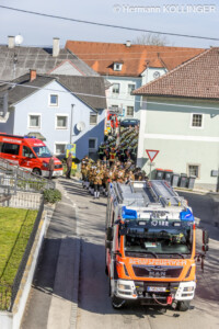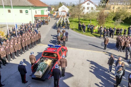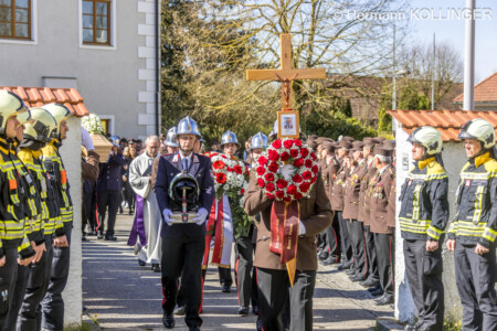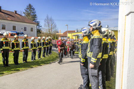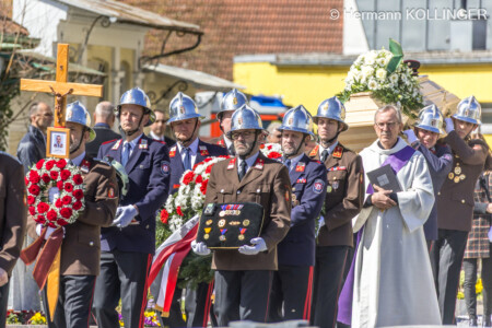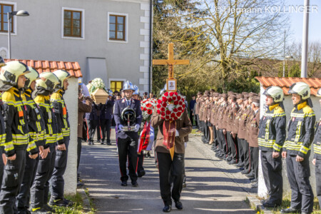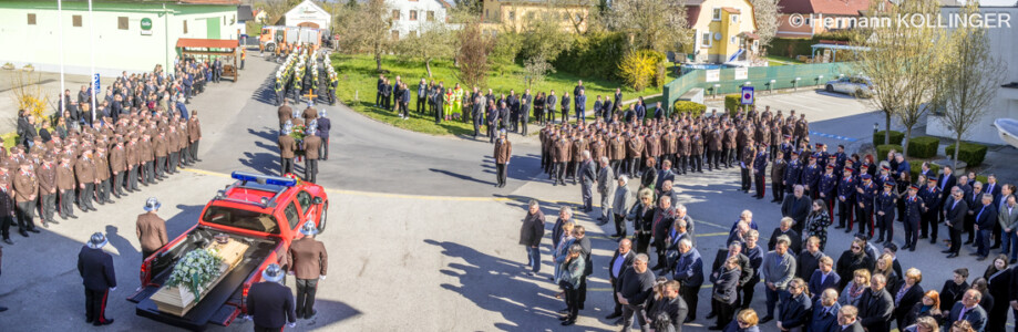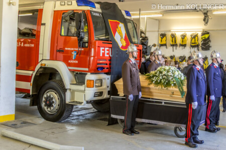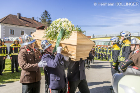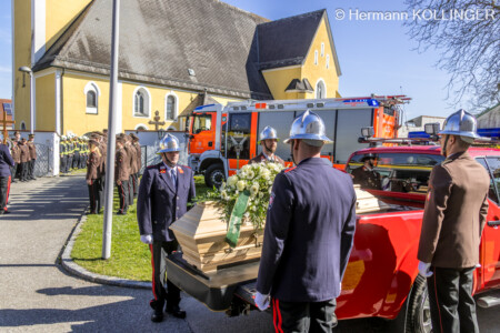 Am Pfarrplatz stand eine Schar an Feuerwehrleuten schlussendlich für die Trauerfamilie Spalier und Harry’s Sarg wurde in die Kirche getragen, der nach der Trauerfeierlichkeit wieder geschultert und zum Grab gebracht wurde. Der letzte Alarm für Harald wurde ausgelöst, sein persönlicher Personenrufempfänger am Polster löste genauso aus wie die Alarmsirene am Feuerwehrhaus, welche bei ihrem Abklingen von den Folgetonhörnern mehrerer Einsatzfahrzeuge abgelöst worden ist. Und Harry’s Schwerkranfahrzeug der Berufsfeuerwehr Linz stand währenddessen vor dem Feuerwehrhaus Wache in Blickrichtung zum Friedhof.