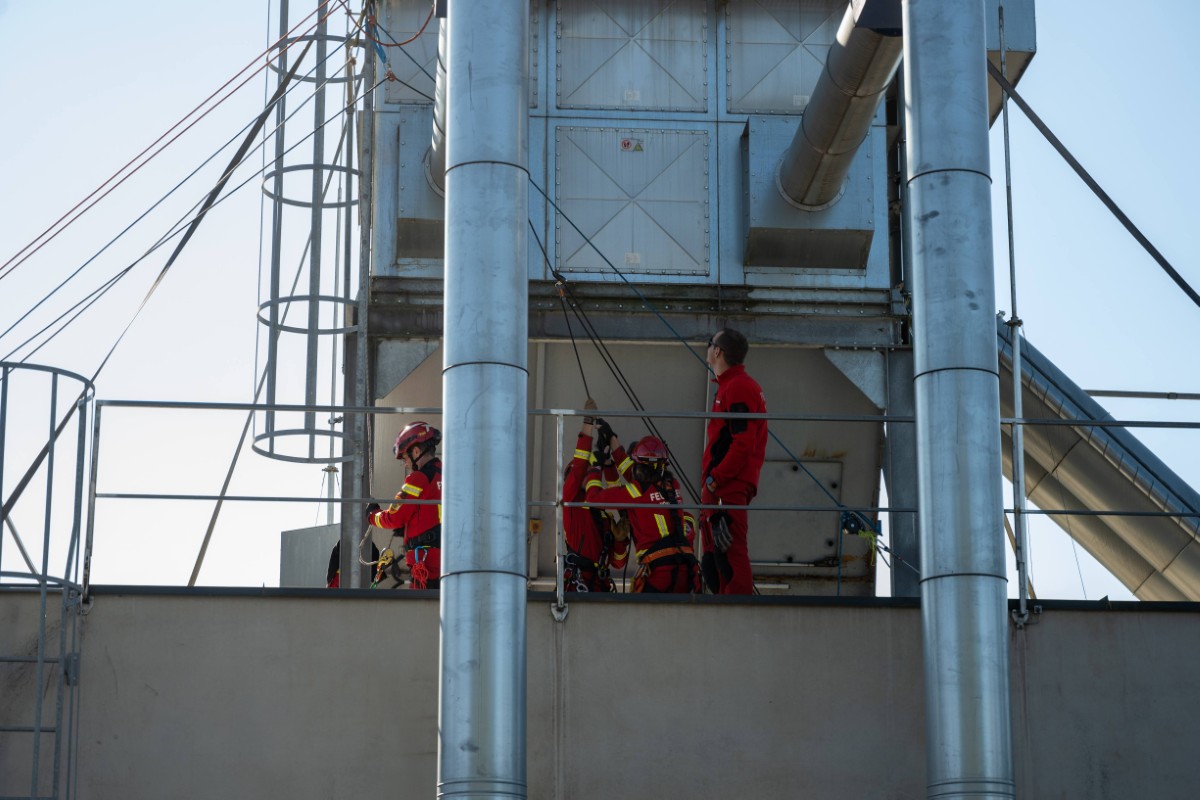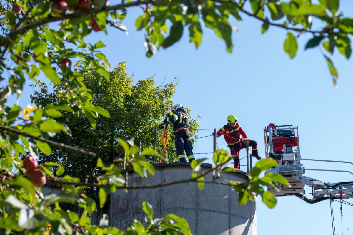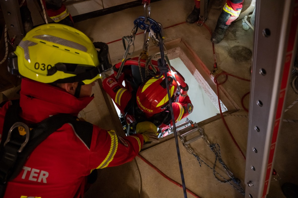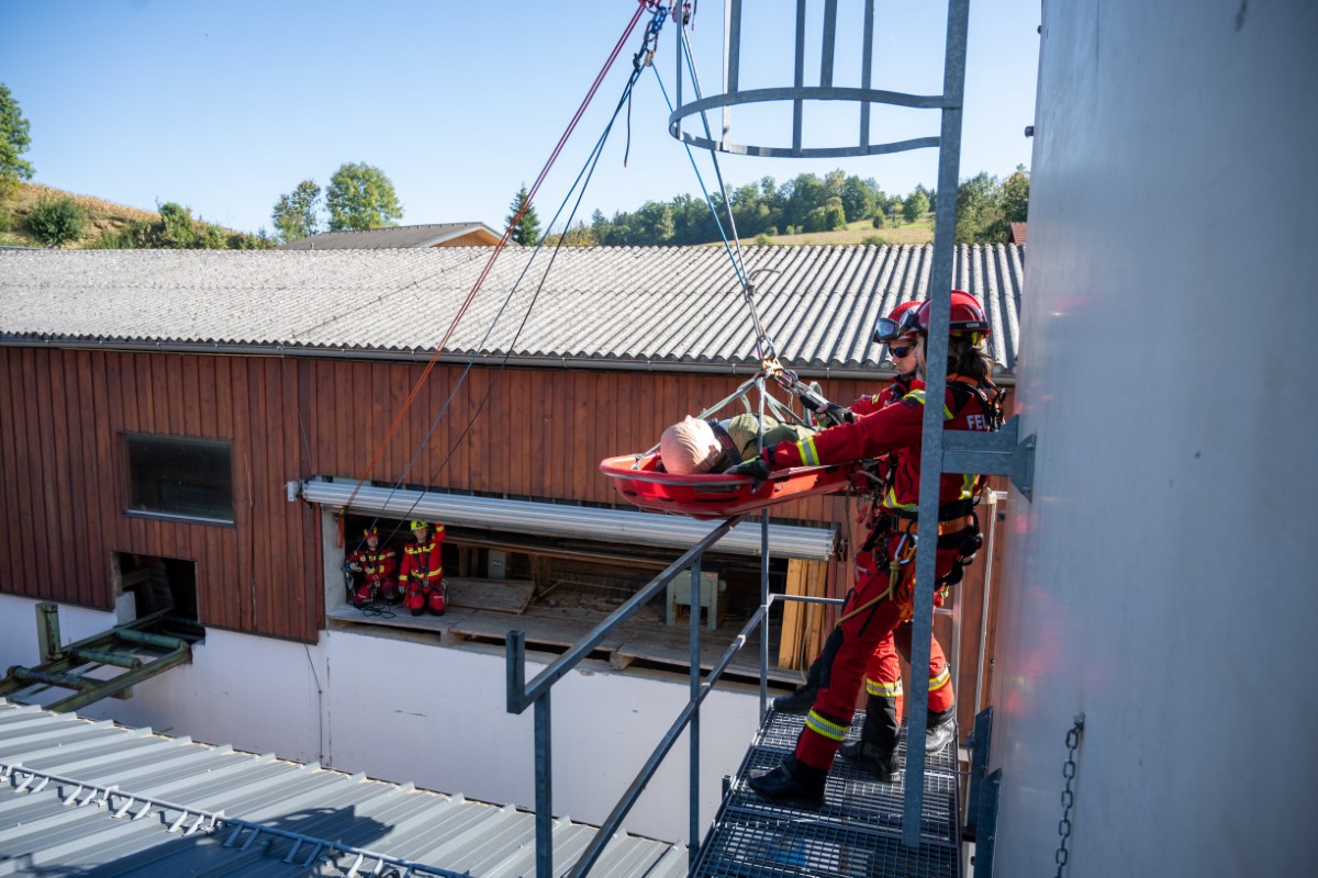 1. Rettung aus einem Silo unter Atemschutz und Übergabe an zweiten Stützpunkt, der das Abseilen zum Boden parallel vorbereitet hatte – im Real-Einsatzfall ist es grundsätzlich geplant, dass jeweils zwei Stützpunkte in Bewegung gesetzt werden.