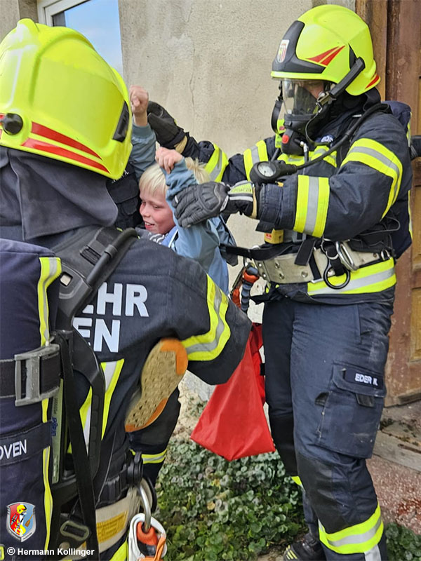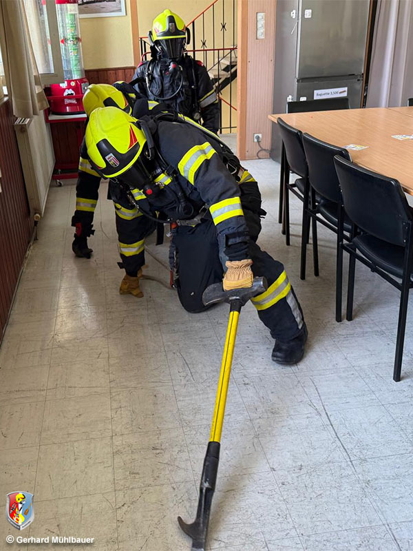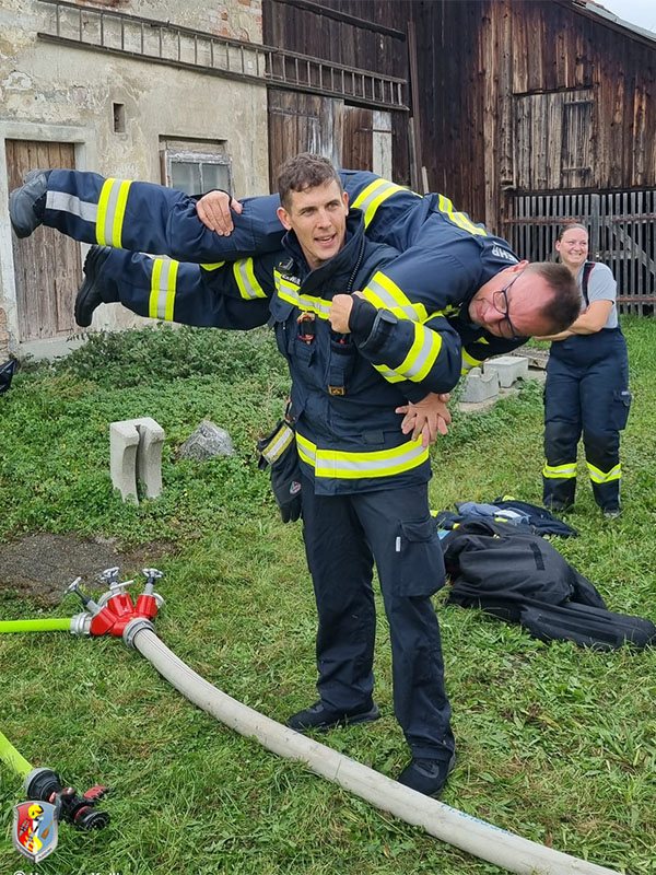 Nach der Mittagspause standen ein Strahlrohrtraining sowie die gewaltsame Türöffnung im Fokus. Ein leerstehendes Gebäude konnte für einen Innenangriff verwendet werden, wo im verrauchten Gebäude drei Personen (zweimal reale Kinder, einmal Puppe) zu suchen und zu retten waren.