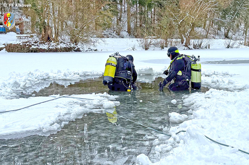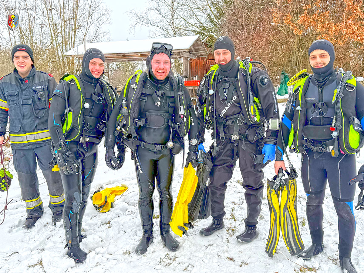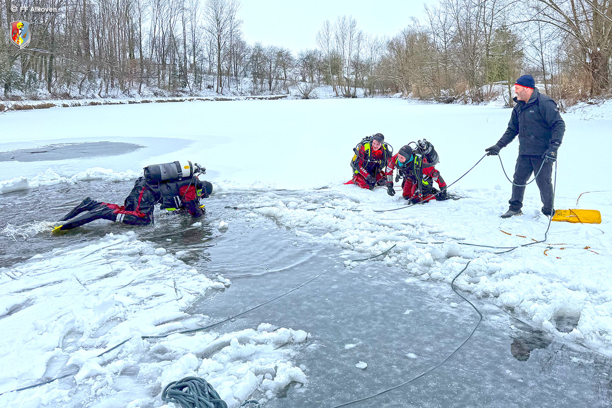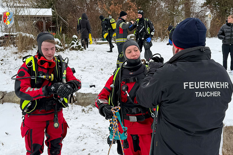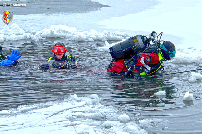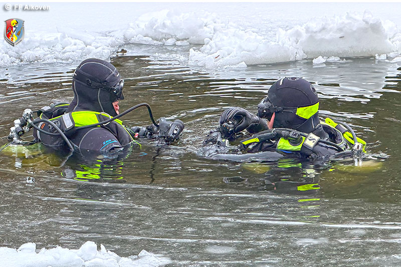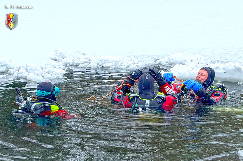 Eistauchen zählt zu den anspruchsvollsten Disziplinen im Feuerwehrtauchwesen. Gerade im Einsatzfall ist der Einstieg unter die Eisdecke oft nur schwer auffindbar, weshalb sämtliche Tauchgänge ausschließlich leinengeführt und gesichert durchgeführt werden. Die Alkovener Feuerwehrtaucher waren mit dieser besonderen Einsatzlage bereits mehrfach konfrontiert – umso wichtiger ist regelmäßiges Training.