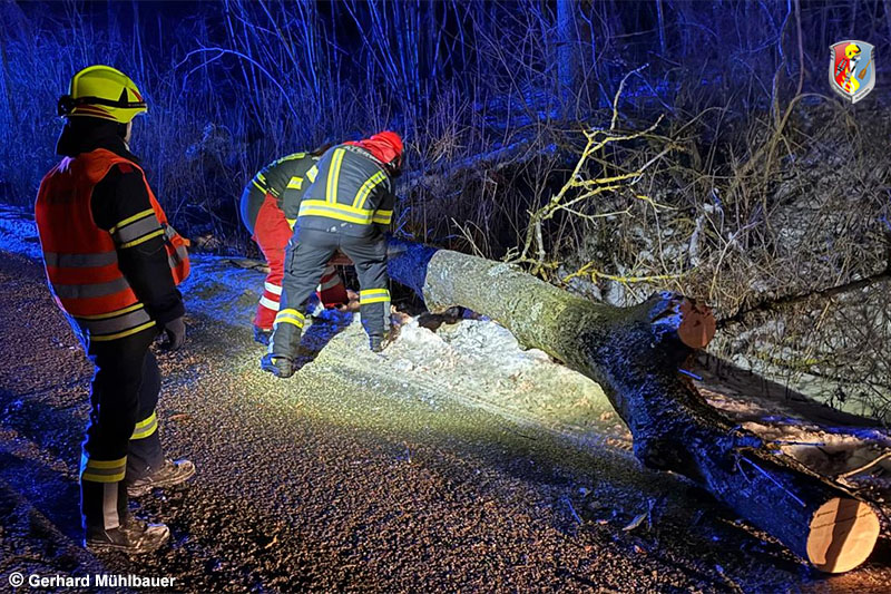 Die Landeswarnzentrale löste nach Meldung durch die Polizei mit 21.08 Uhr die Personenrufempfänger aus. Die Besatzung des erstausrückenden Kleinlöschfahrzeuges konnte weitere Kräfte gleich abbestellen und zerkleinerte per Kettensäge den über die Straße liegenden Baum.