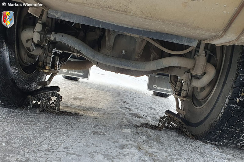 Sinn und Zweck war es, das unterschiedliche Verhalten von Schleuderketten (das Rüstlöschfahrzeug ist mit diese ausgestattet) und normalen Schneeketten einmal praxisnah ausprobieren zu können.