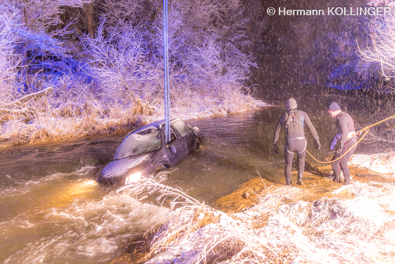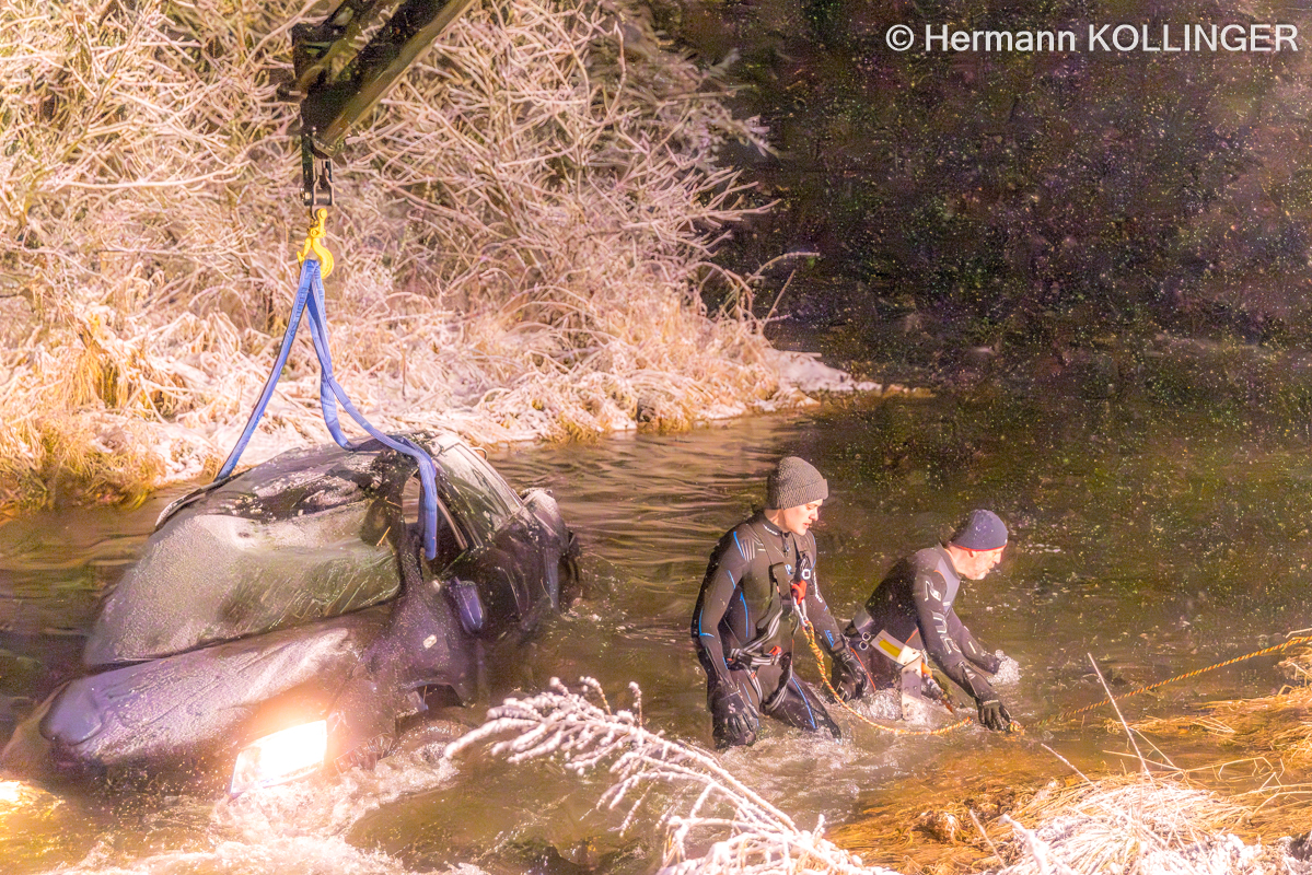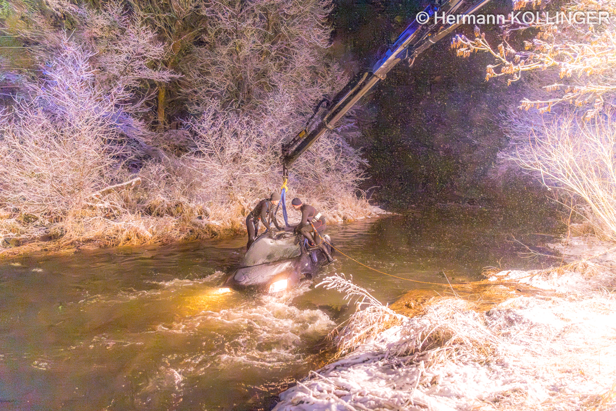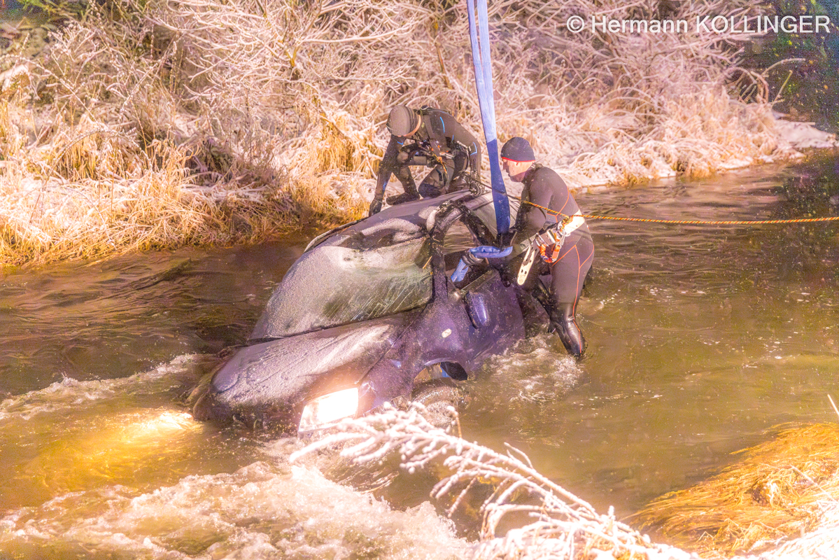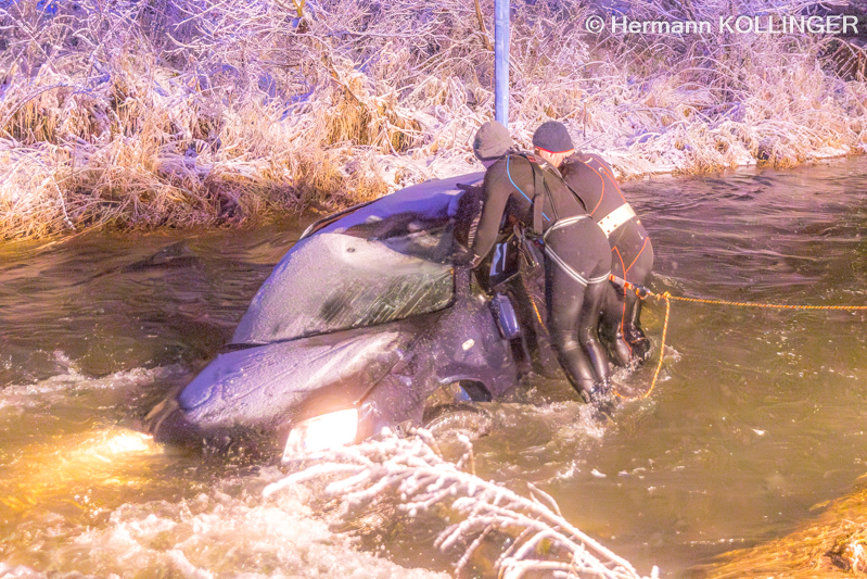 In weiterer Folge wurde über die Landeswarnzentrale in Linz die Feuerwehr Alkoven mit dem Kranfahrzeug angefordert. Aufgrund der Strömung im Gewässer erfolgte ebenso die Anforderung von Tauchern mit Neoprenanzug für das Anschlagen des Pkw.