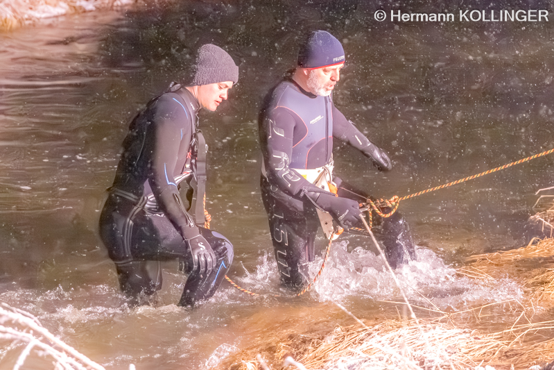 An Leinen gesichert machten sich vor Ort zwei Taucher der FF Alkoven daran, den Pkw für die Bergung anzuschlagen. Entgegen des sonst üblichen Anschlagens mit vier Punkten, musste aufgrund der Bedingungen und ohnehin verursachten Totalschadens am Pkw auf die eher unattraktive Variante des Anschlagens über das Fahrzeugdach ausgewichen werden.