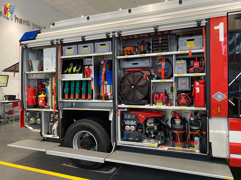 Wichtig war es der Arbeitsgruppe vor allem, möglichst viel Ausrüstung am gleichen Platz wie beim Rüstlöschfahrzeug zu platzieren, um den Ausbildungsaufwand auch entsprechend zu reduzieren. Mit dem Großteil der Geräte ist das nun auch gelungen, so dass es auch zur Ähnlichkeit am Pumpensystem möglich war, das TLF 4000 noch am gleichen Tag in den aktiven Einsatzdienst zu stellen und den Vorgänger zu pensionieren.