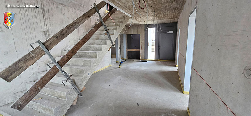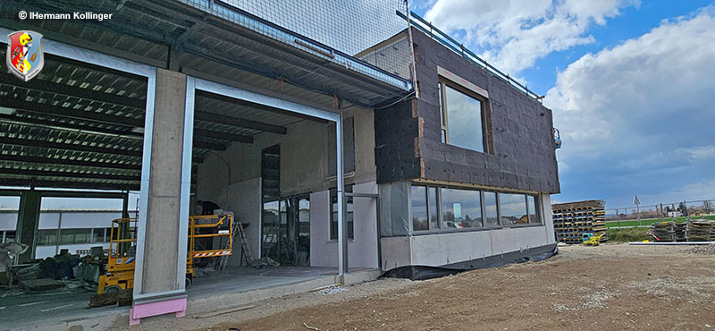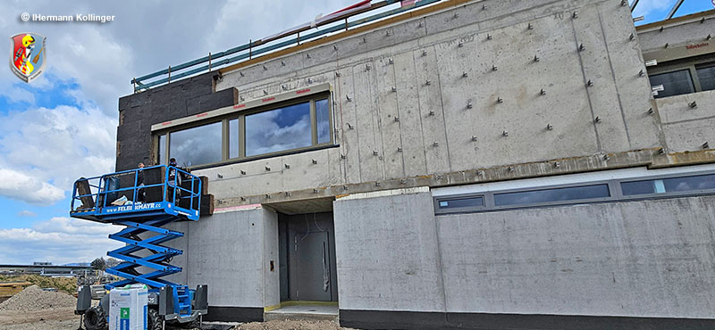 Im Erdgeschoß bleibt es überwiegend beim Sichtbeton. Wärmedämmung wird inzwischen auch im Westbereich der Fahrzeughalle angebracht, an deren Seite sich die Verwaltungsräume, Garderoben, Einsatzzentrale und dergleichen befinden werden.
