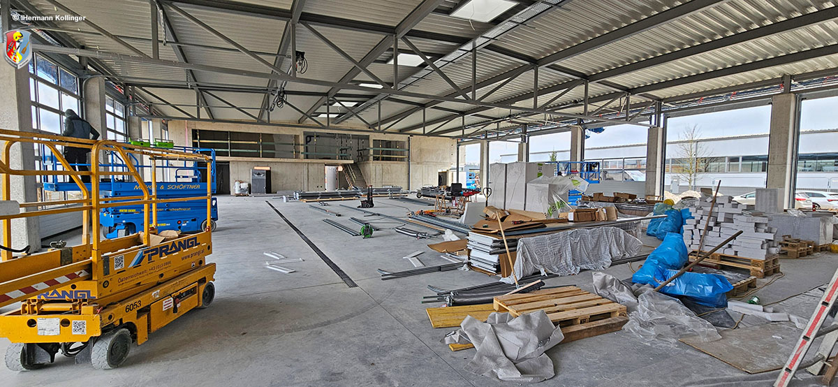 Mit dem Trocknen des Estrichs sowie des geschliffenen Industriebodens im Bereich der neuen Fahrzeughalle sowie des Osttrakts (Werstättenbereich) sind nun die Arbeiten auch im Innenbereich voll im Gange.