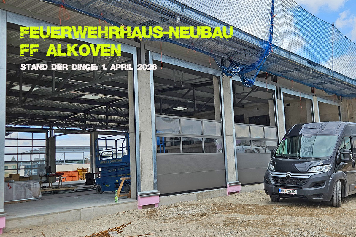 Hochbetrieb herrscht mit Stand vom 1. April 2026 – ohne Scherz – auf der Baustelle für das neue Feuerwehrhaus Alkoven beim Kreisverkehrs nach dem Lagerhaus Richtung Hartheim. Auch der Innenausbau ist voll im Gange.