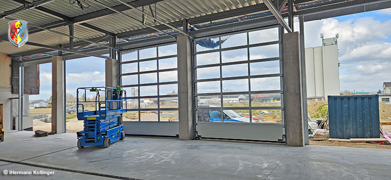 Mit 1. April 2026 hat der Maler seine Arbeit begonnen, während auch die Elektrik weiter installiert wird. Begonnen hat auch der Einbau der Tore in der Fahrzeughalle. Diese sind auf den beiden Seiten verschieden ausgeführt.