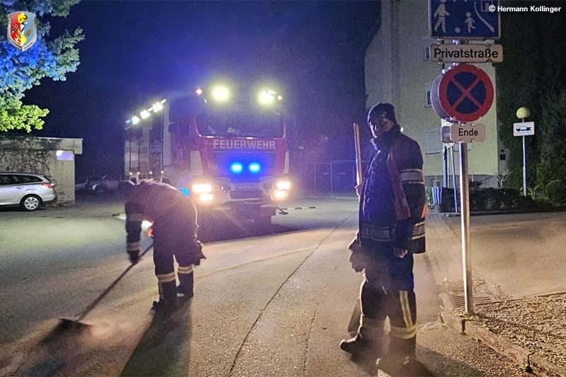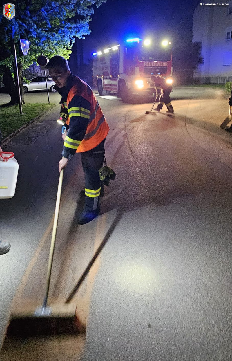 Während mit Bindearbeiten im erforderlichen Ausmaß an den notwendigen Stellen vorgenommen wurden, wurden gleichzeitig weitere Kräfte der Feuerwehr Alkoven in Marsch gesetzt, um die Arbeiten von der Jet-Tankstelle bis Hartheim in der Gegenrichtung vorzunehmen.